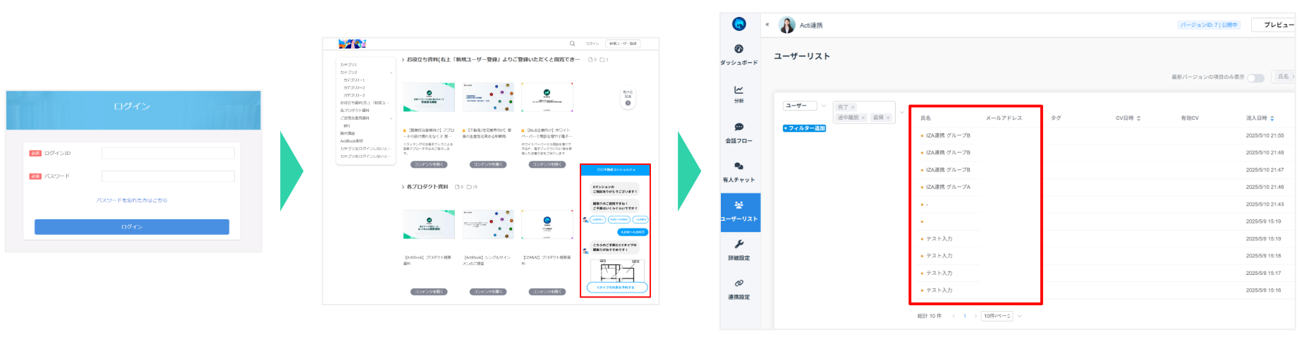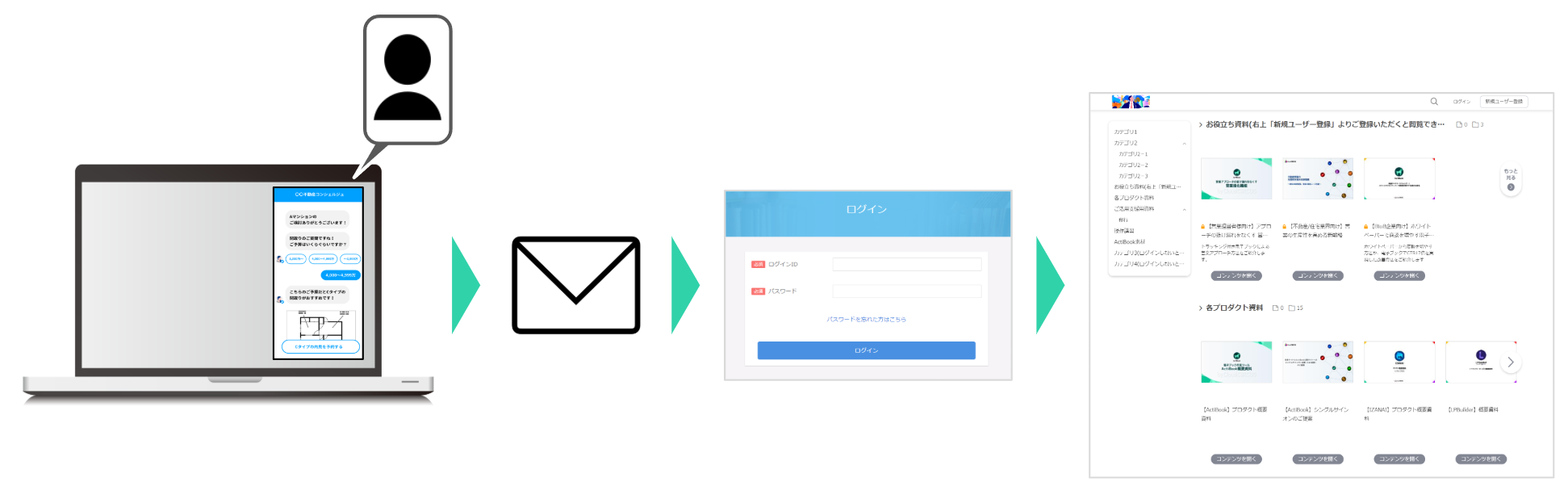 ■【IZANAI連携】ボットで取得したユーザー情報をActiBookの本棚サイトユーザーとして連携できる機能を実装 IZANAI→ActiBookへユーザー連携する機能です。 IZANAIのチャットボットで「氏名」「メールアドレス」を取得すると、ActiBookから本棚サイトのログインIDをメールで自動送信します。 IZANAIとActiBook両方に情報を入力(登録)するエンドユーザーのひと手間を省くことができます。 |